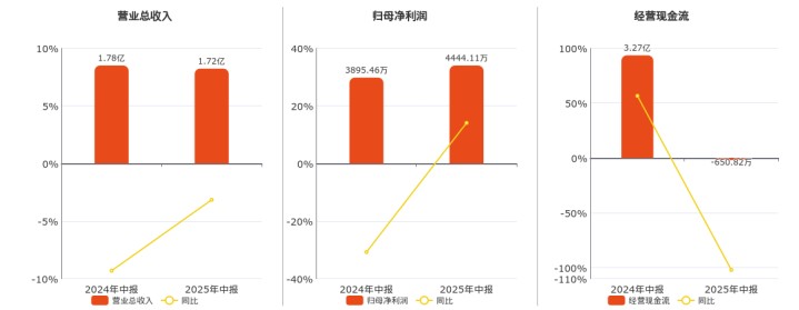 公司营业总收入为1.72亿元,较去年同报告期营业总收入减少561.60万元,同比较去年同期下降3.15%。归母净利润为4444.11万元。经营活动现金净流入为-650.82万元,较去年同报告期经营活动现金净流入减少3.34亿元,同比较去年同期下降101.99%。